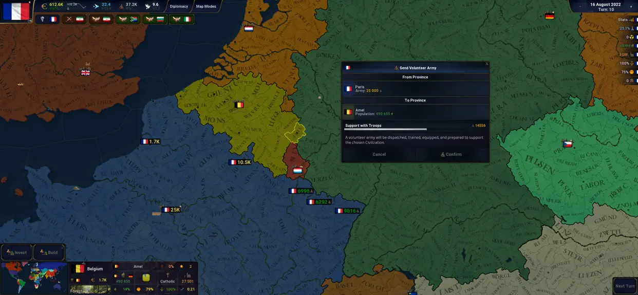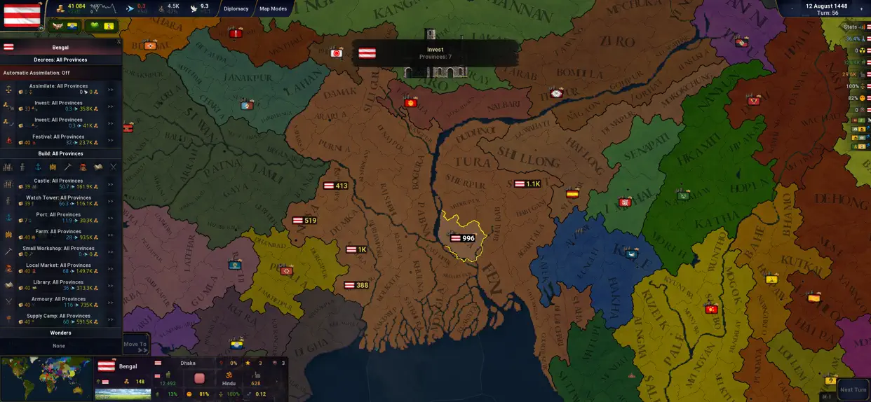 批量省份操作,可一键对所有省份进行投资、建设或同化。